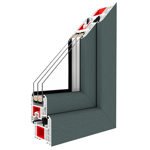 Energieersparnis durch optimierte Konstruktion des Profils, spezifisches Dichtungssystem aus geschäumten EPDM und Verbundglas mit niedrigem Wärmedurchgangskoeffizienten.